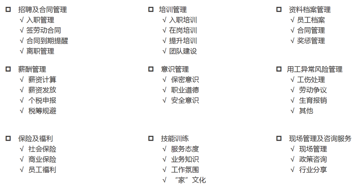 從(cóng)人(rén)力資源六大(dà)模塊著(zhe)手,建立健全人(rén)力資源管理(lǐ)',有(yǒu)效控制(zhì)風(fēng)險,降低(dī)成本,提升效率